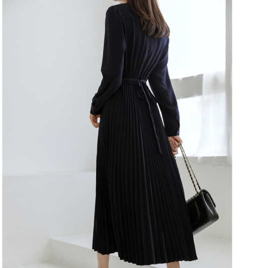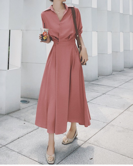 スタンドカラーキーネックソリッドカラーワンピース 1965