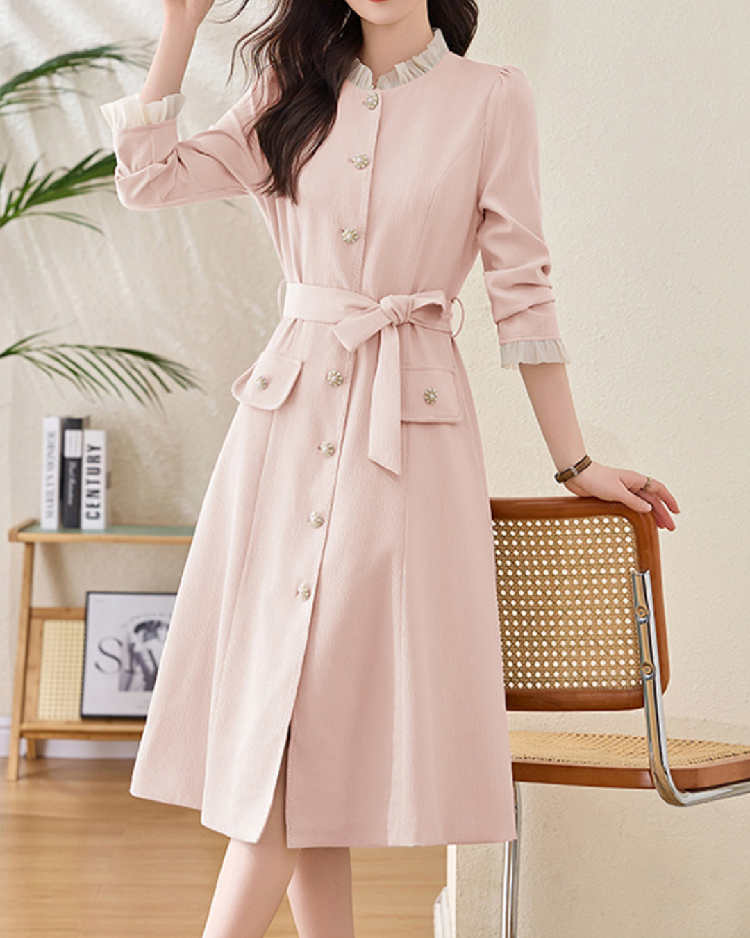 フリルスタンドカラーフラワーボタンワンピース 2333