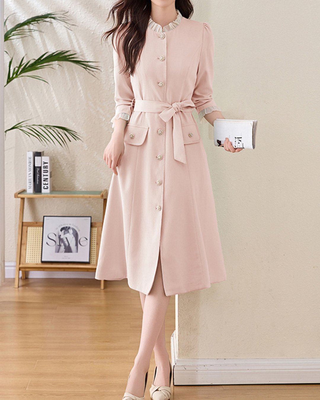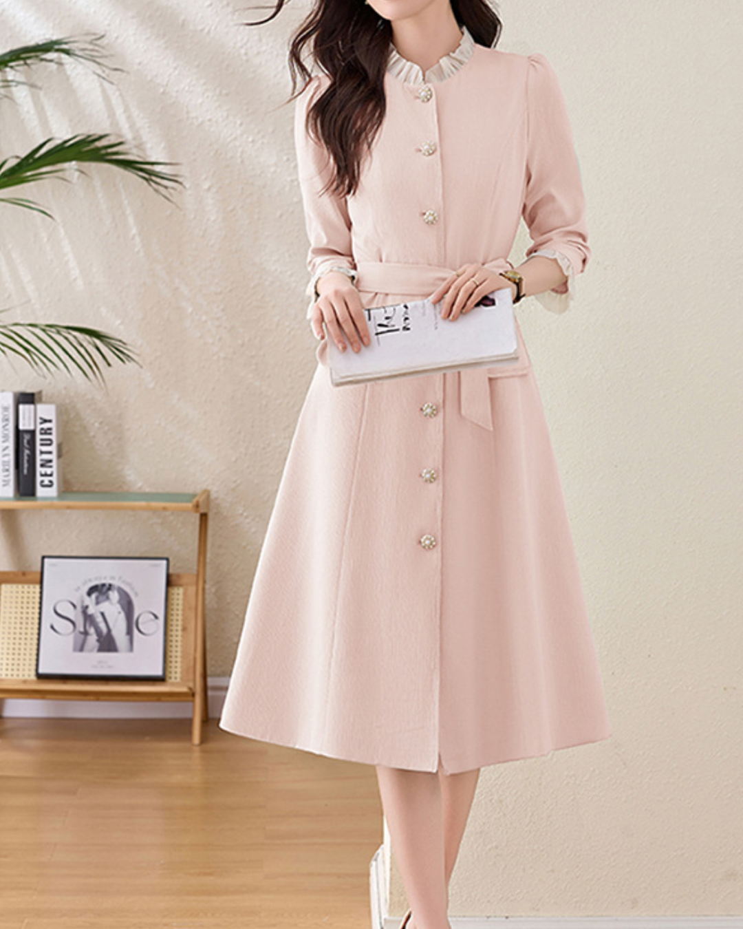 スタンドカラーキーネックソリッドカラーワンピース 1965